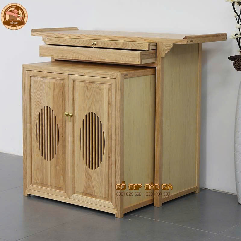 Màu gỗ tự nhiên với tông nâu nhạt hoặc nâu trầm (tùy chọn sơn hoàn thiện) dễ dàng kết hợp với các vật dụng thờ cúng khác như đèn thờ, lọ hoa, đỉnh đồng, tượng Phật hay đồ gốm Bát Tràng. Tạo nên một tổng thể không gian trang nghiêm nhưng không quá nặng nề. Sự tinh giản về kiểu dáng không làm mất đi bản sắc văn hóa mà ngược lại còn giúp không gian thờ cúng trở nên nhẹ nhàng, thanh tịnh và gần gũi hơn trong đời sống hiện đại.