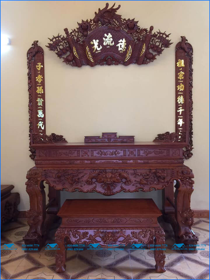 Bàn thờ A 8028 được các nghệ nhân của Gỗ Đẹp rất chú trọng và vô cùng tỉ mỉ với từng đường nét chạm khắc. Xung quanh bàn thờ hay bốn chân bàn thờ cùng bàn cơm nhỏ đều được nhấn nhá bởi những họa tiết rồng phượng mang lại cho không gian thờ cúng một sự thanh tịnh và vô cùng trang nghiêm.