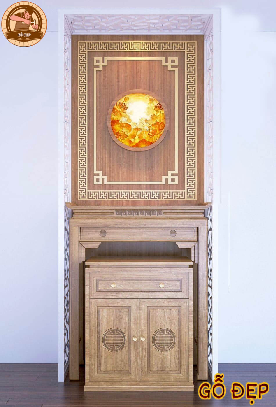 Điểm nhấn vô cùng độc đáo của phần bàn thờ chính là chi tiết chạm trổ triện sen vô cùng mềm mại, cầu kỳ. Từng đường nét cực kì "có hồn" làm tăng thêm phần sang trọng và thu hút. Tay cầm ngăn kéo nhỏ gọn và được mạ vàng vô cùng nổi bật, trang nhã. Lối thiết kế chân quỳ làm tổng thể bàn thờ thêm phần vững chãi, bền chắc. Bên cạnh đó, chiếc bàn cơm nhỏ với điểm nhấn là chi tiết chạm đục biểu tượng chữ Vạn cách điệu. Mang ý nghĩa mong cầu đem lại nhiều vận may, tiền tài và sự thịnh vượng cho gia chủ.