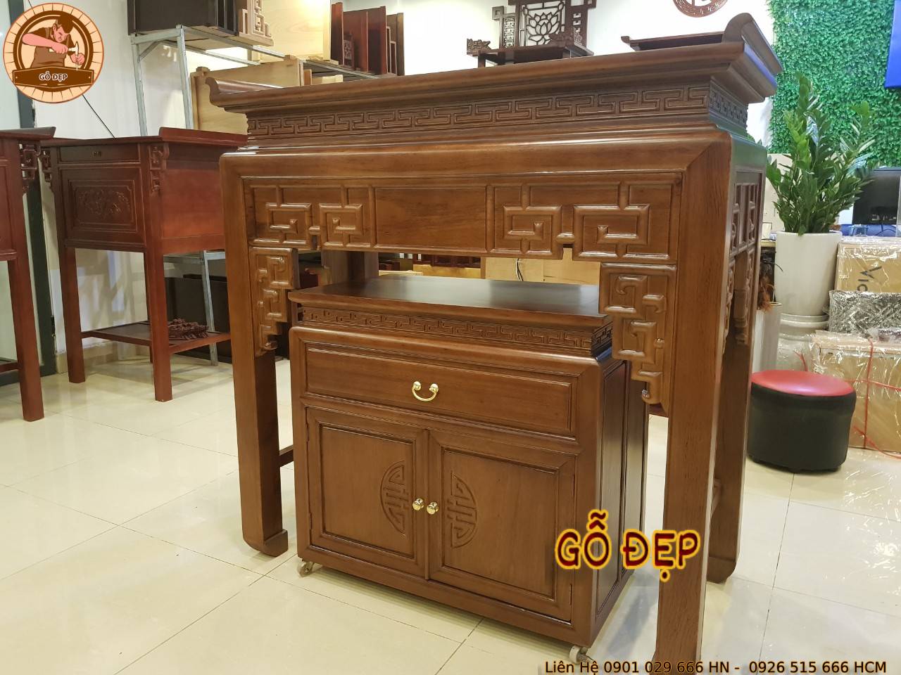 - Mẫu Bàn Thờ BT 08 Gỗ Gụ Kích Thước ngang 1270 sâu 610 cao 1270 đang trưng bày tại showroom