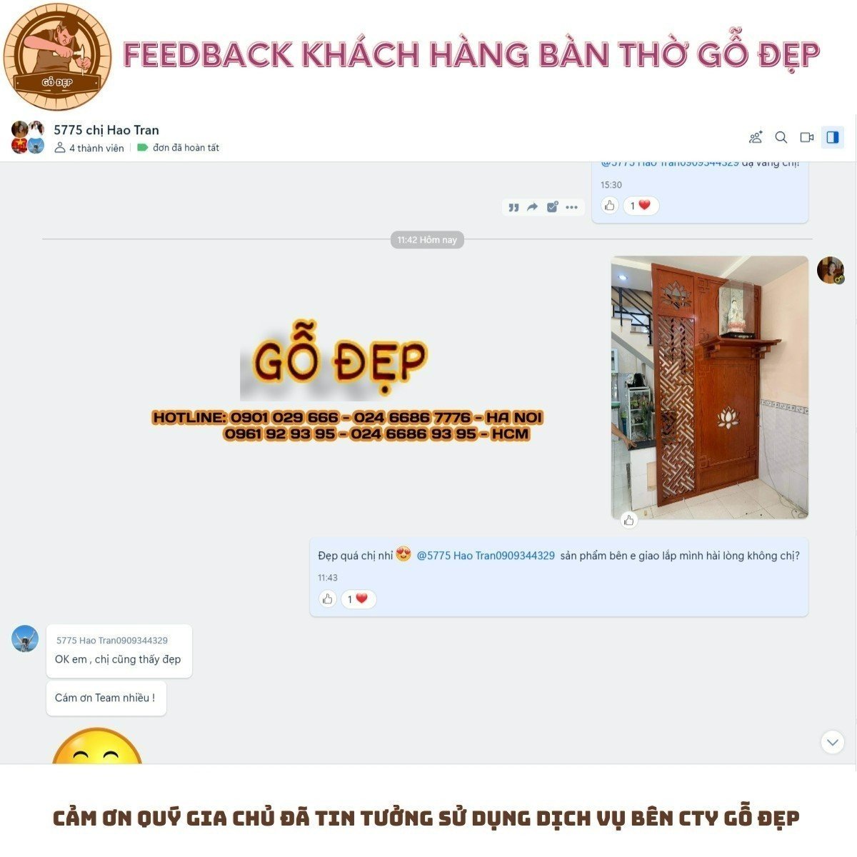 Tôi cũng rất hài lòng với sản phẩm và cả việc lắp phòng thờ The Manor Mỹ Đình. Dù vợ chồng tôi có hơi khó tính nhưng hình như không ảnh hưởng đến tinh thần làm việc của các bạn. Thật sự tôi cảm ơn Kiến Trúc Gỗ Đẹp đã cho gia đình tôi một trải nghiệm tuyệt vời.” Đây là trích nguyên lời cảm ơn của chị Thu gửi đến chúng tôi.
