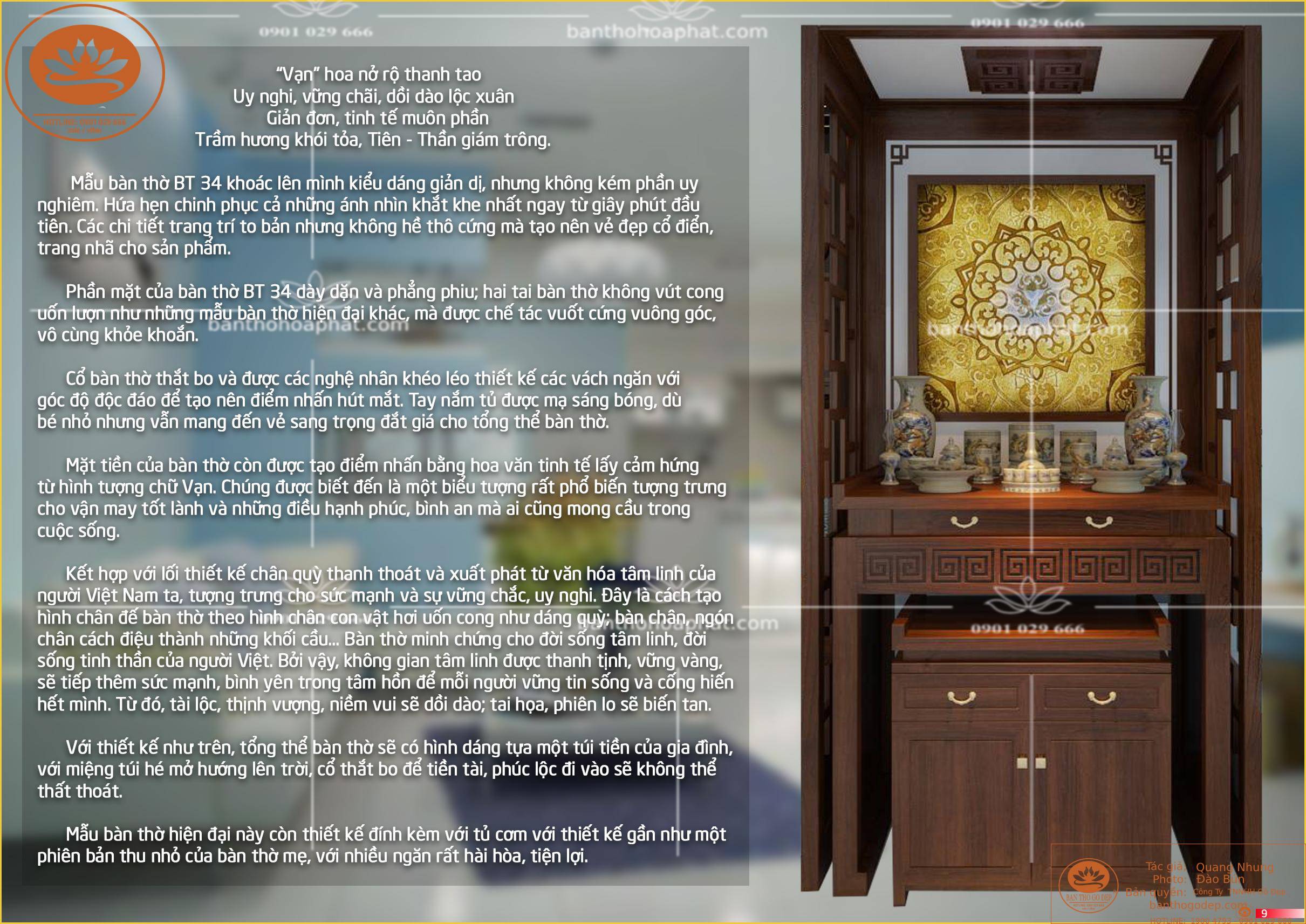 “ Dạ Vâng ạ, anh yên tâm cái này là nghề của bên em rồi, em sẽ thiết kế cho anh ạ. Không gian phòng thờ chung cư thường rất bé, vậy em sẽ thiết kế cho anh mẫu bàn thờ BT 34. Với kích thước 107 x 61 x 127, làm vách 2 bên để không gian thờ thêm ấm cúng hơn.”