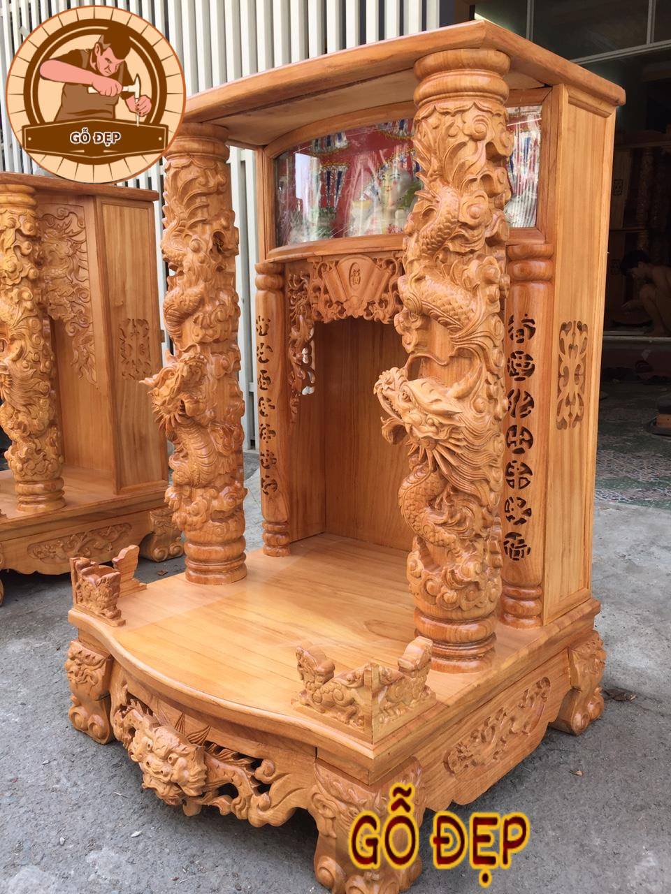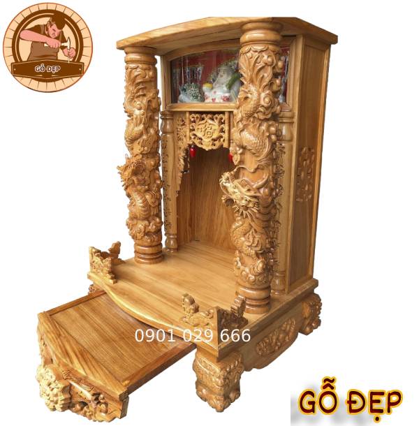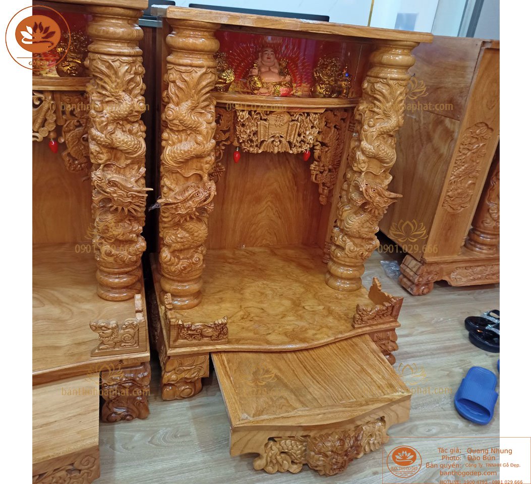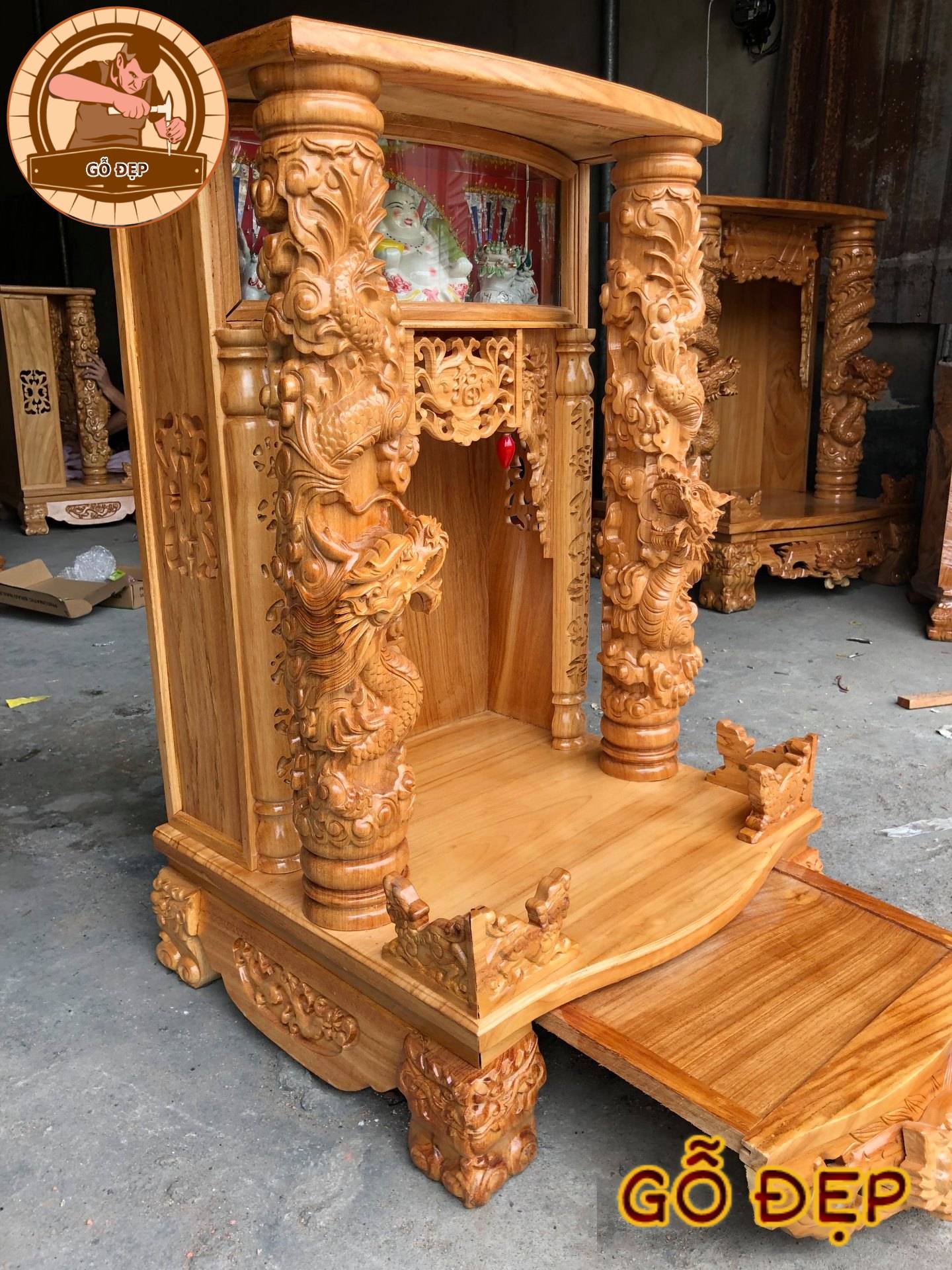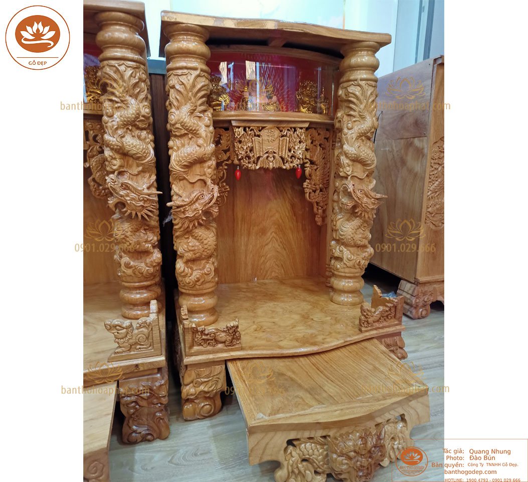 + Cột trụ chắc chắn, chân cong uyển chuyển, mặt thờ rộng rãi dễ dàng bày trí tượng Thần Tài – Ông Địa, bát nhang, đèn, hoa quả và các vật phẩm phong thủy khác.