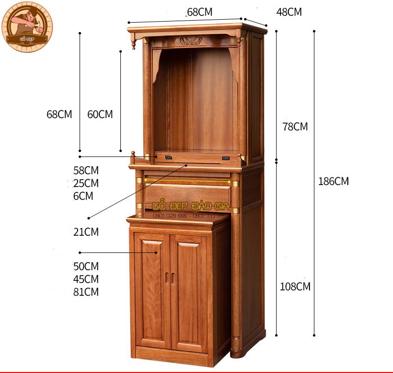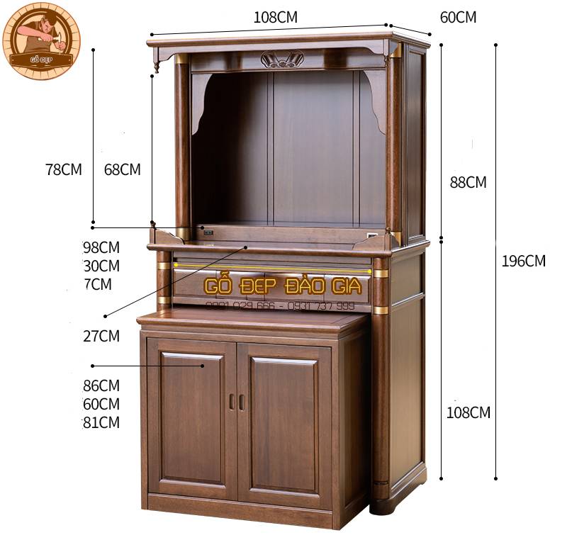 Bàn thờ Phật Gỗ Gõ có kích thước chuẩn Ngang 108 cm, Sâu 61 cm và Cao 196 cm, giúp phù hợp với nhiều không gian thờ cúng từ gia đình nhỏ đến những ngôi nhà rộng lớn. Với kích thước này, bàn thờ không chỉ đảm bảo sự trang nghiêm, mà còn tạo ra không gian thờ cúng thoải mái, rộng rãi cho các vật phẩm thờ cúng như tượng Phật, đèn, hương, và các đồ thờ khác.
