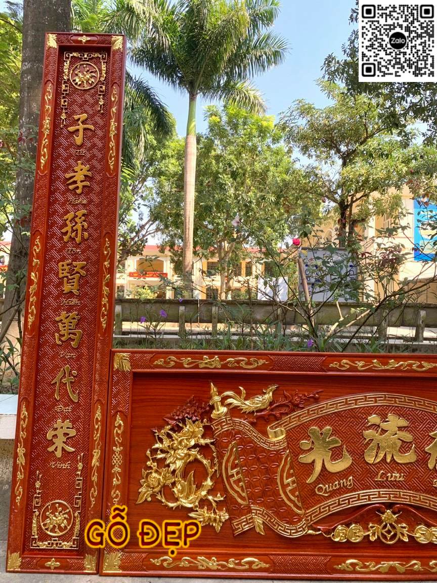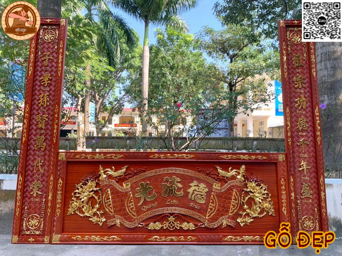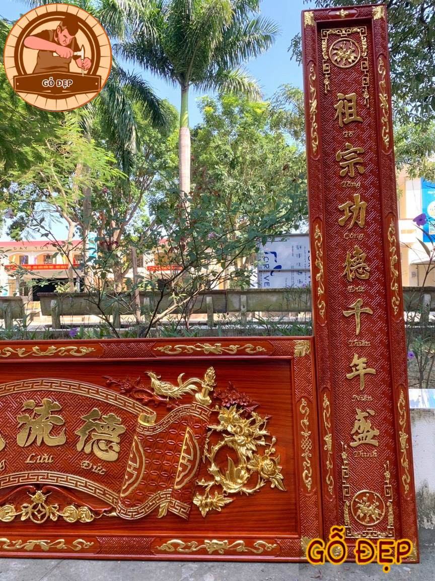 + Bề mặt ván hoành phi và câu đối dày 2.5 – 4cm, tạo chiều sâu và độ bề thế rõ rệt