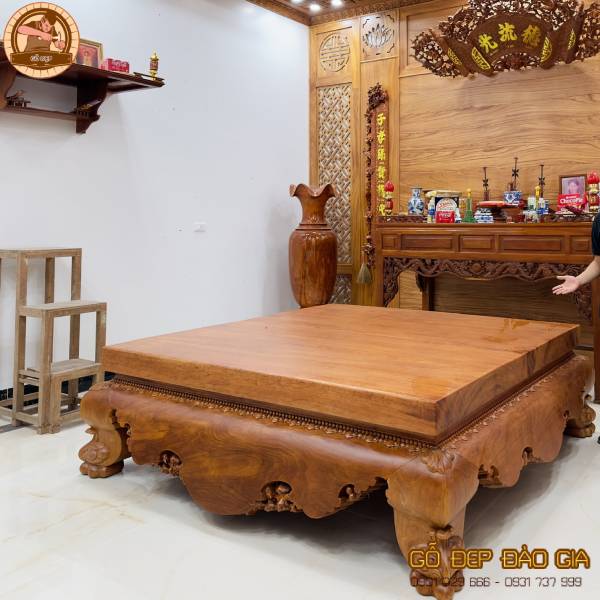 Với kích thước lớn: dài 2m2, rộng 1m8, mẫu sập này thích hợp đặt trong phòng khách, phòng thờ, nhà gỗ cổ truyền hoặc những không gian rộng rãi có chiều sâu văn hóa.
