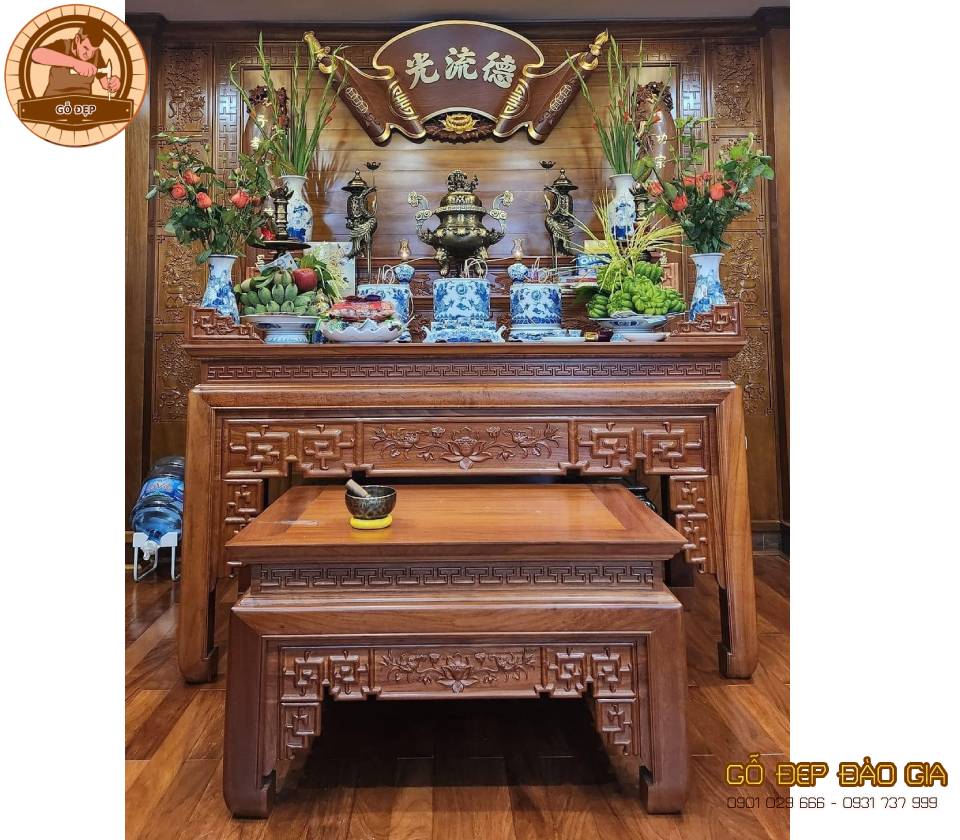 Sản phẩm được thiết kế theo phong cách cổ điển với những đường nét chạm khắc tinh xảo, tỉ mỉ, mang lại vẻ đẹp thanh thoát và trang nhã. Bàn thờ có phần vách hậu làm từ gỗ gõ đỏ, giúp tăng thêm sự vững chắc và tính thẩm mỹ cho sản phẩm. Vách hậu này có giá 3.900.000 đồng cho mỗi mét, với chất liệu đồng bộ tạo sự hài hòa, đồng nhất trong thiết kế.