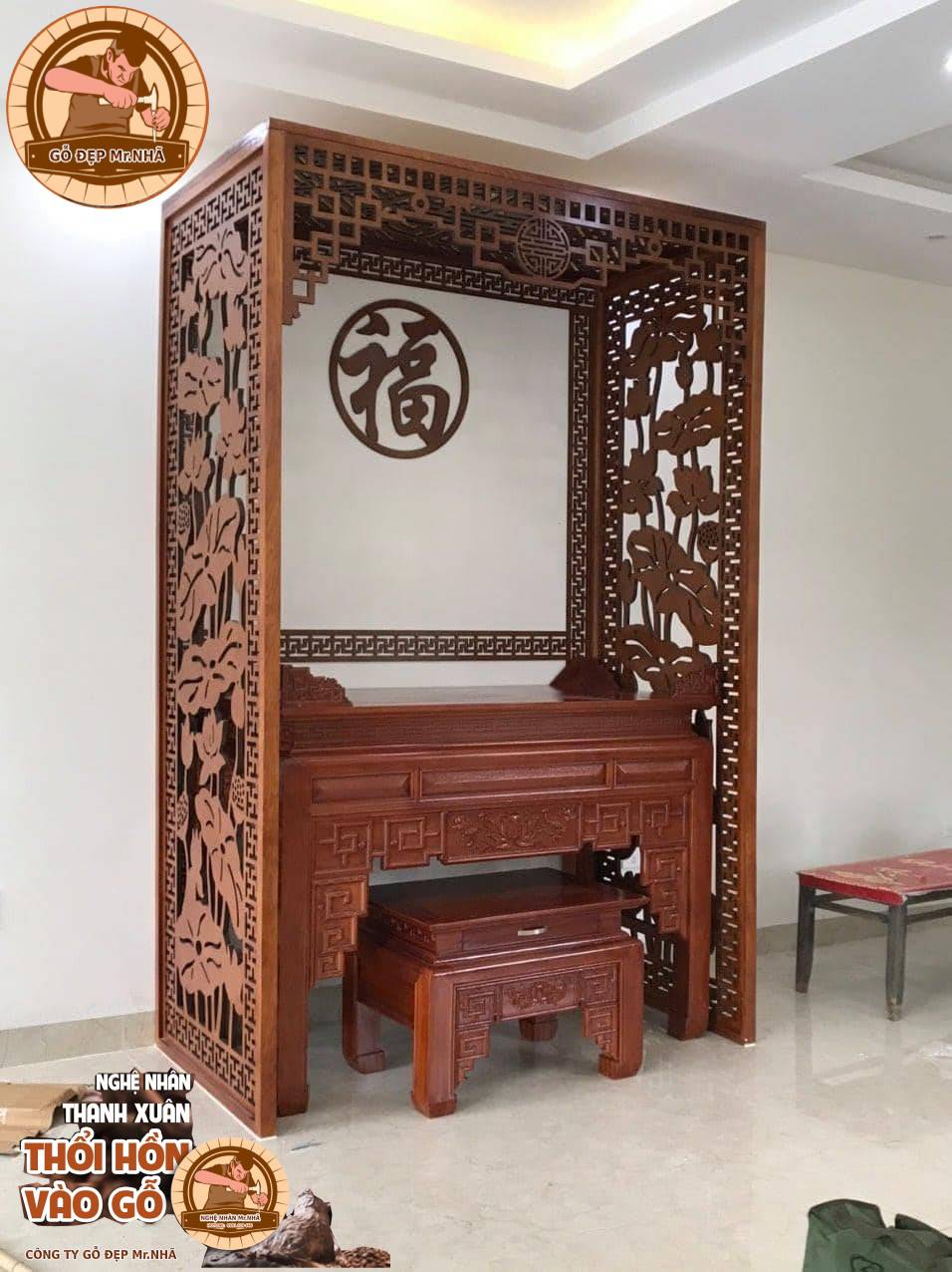 Vách Bàn thờ được thiết kế với hình dáng hoa sen tinh xảo và các chi tiết trang trí đẹp mắt, tạo nên một không gian yên bình và tâm linh cho gia đình.